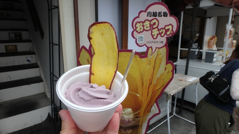 川越名物のおさつチップが乗ったソフトクリーム。